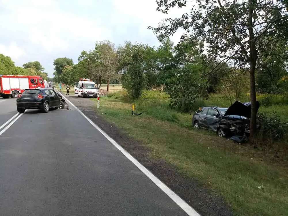 Godz. 16.22 Zderzyły się nissan i volkswagen, który wypadł jeszcze z drogi i uderzył w drzewo. Nissan został na drodze. Do szpitala trafiły dwie osoby, kierowcy samochodów. Na miejscu cały cza spracują policjanci.