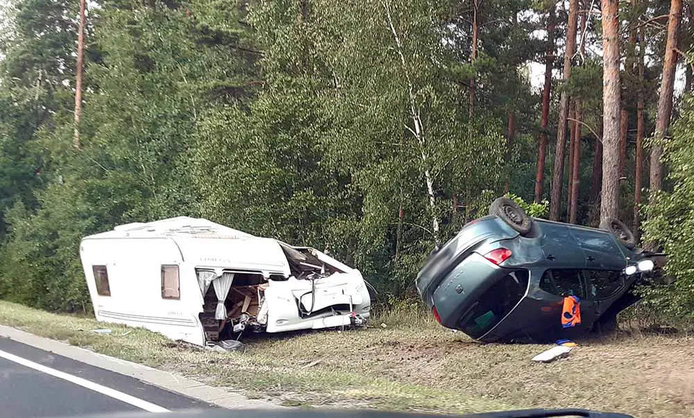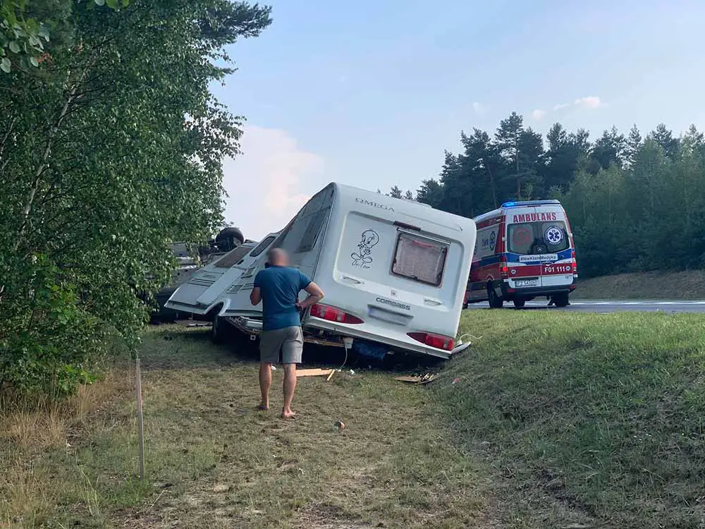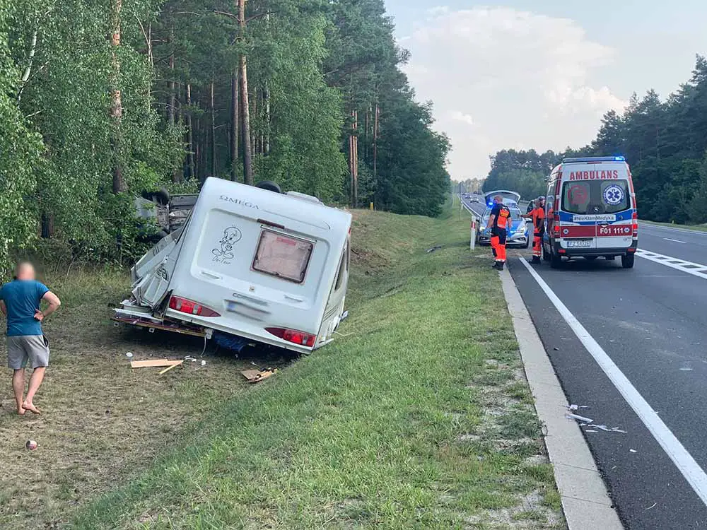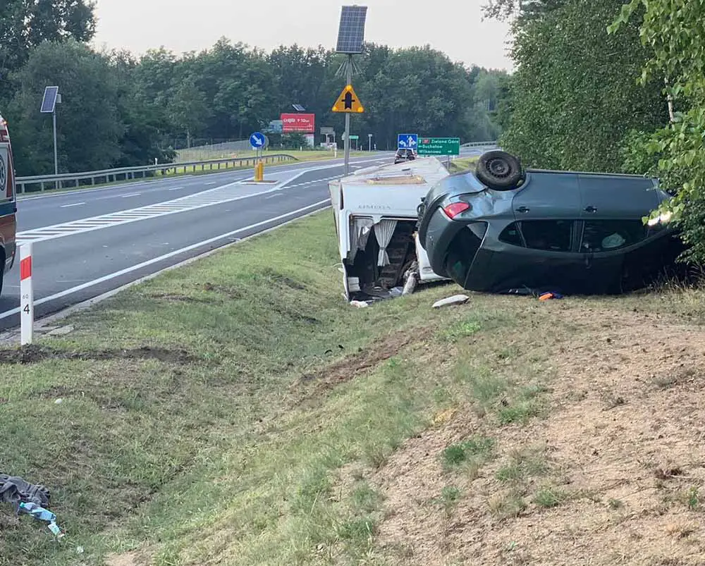 Kierujący seatem z przyczepą kempingową jechał w kierunku Zielonej Góry. Przed skrzyżowaniem z drogą do Wilkanowa wpadł w poślizg i wypadł z trasy. Samochód dachował uderzając w drzewo. Na pobocze wypadła też przyczepa kempingowa.