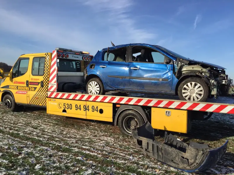 – Na polecenie policji zabezpieczyliśmy rozbite renault – mówi Marek Dziubałka z pomocy drogowej Maxmar.