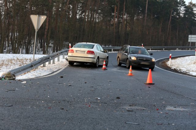 Kiedy policjanci kończyli pracę na miejscu zderzenia saaba z ciężarówką, w tym samym miejscu doszło do kolejnej kraksy. Kierowca ciężarówki zjeżdżający z „trójki” wymusił pierwszeństwo na prawidłowo jadącym „małym” fiacie. Na szczęście nikomu nic się nie stało.