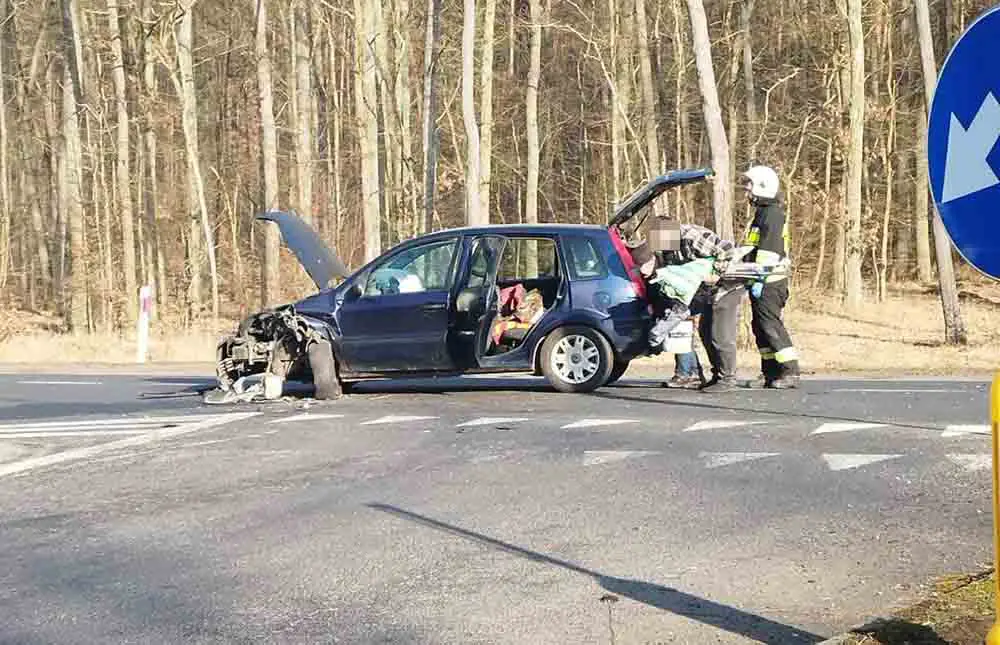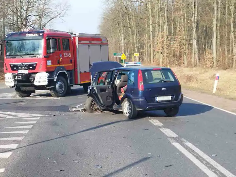 Zderzyły się renault i ford. Najprawdopodobniej kierujący fordem zajechał drogę kierującej renault i wtedy doszło do zderzenia. Renault wypadło z drogi, a ford stoi na jezdni. Ranne zostały dwie osoby, w tym małe dziecko. Droga w miejscu wypadku jest zablokowana, na miejscu pracują służby. Dojechały trzy zastępy strażaków z Gorzowa, karetka pogotowia ratunkowego oraz policja.