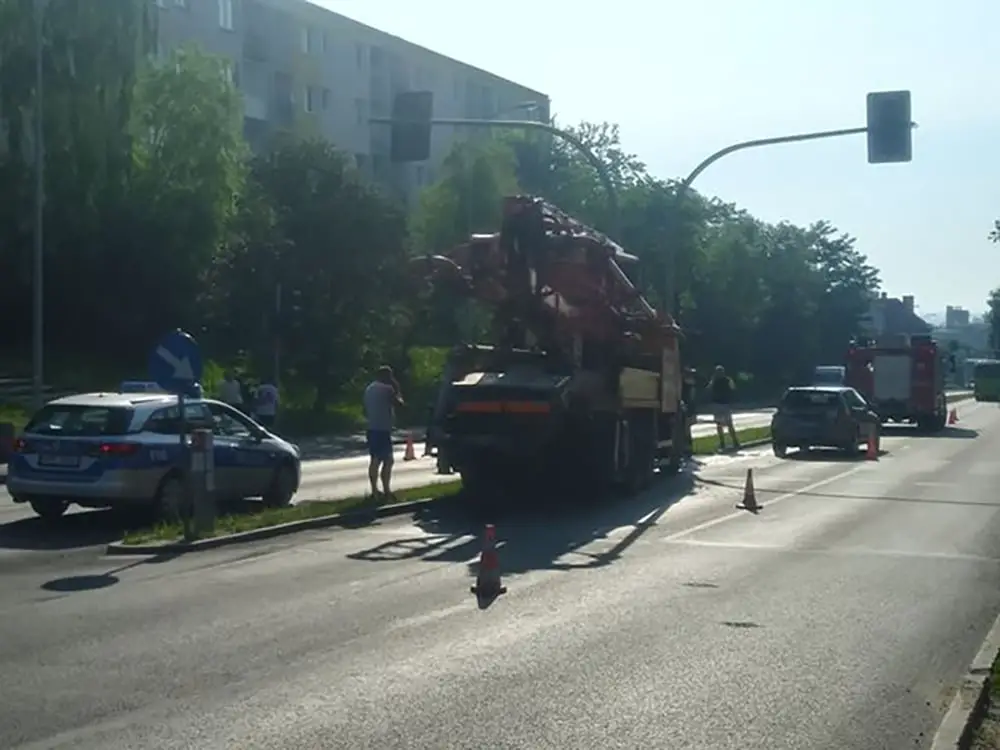 Do zdarzenia doszło po godz. 7.00. Kierujący ciężarówką jechał ul. Konstytucji 3 Maja. Najprawdopodobniej w ostatniej chwili zauważył zatrzymującego się przed światłami volkswagena. Nie zdążył zahamować i uderzył w tył samochodu. Chcąc uniknąć zderzenia wypadł na koniec z drogi i uderzył w słup sygnalizacji świetlnej.