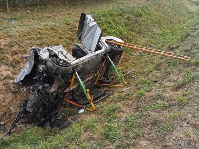 Po zderzeniu, do którego doszło w piątek, 7 sierpnia, jeden samochód został na drodze, a drugi leżał na boku w rowie. W leżącym samochodzie były dwie zakleszczone osoby.