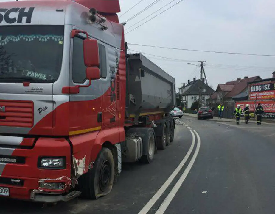 Renault ma mocno rozbity przód i rozerwane drzwi. W ciężarówce widać uszkodzenia przodu oraz pękniętą oponę.