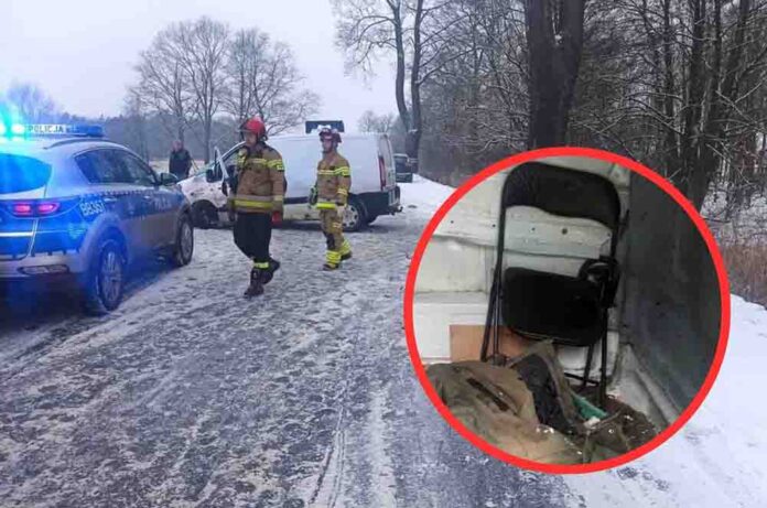 Policjanci na miejscu ustalili, że kierujący samochodem dostawczym nie dostosował prędkości do warunków panujących na drodze. Wpadł w poślizg i uderzył w przydrożne drzewo. Jak ustalili mundurowi, jeden z pasażerów siedział na plastikowym krzesełku w przestrzeni bagażowej. w miejscu do tego całkowicie nieprzystosowanym. Nieświadomy nadchodzącego zagrożenia 18-letni pasażer siedział na składnym krześle.