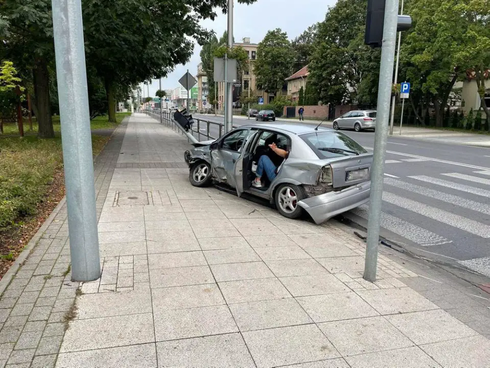 Samochody zderzyły się na środku skrzyżowania. Bmw zostało na jezdni. Opel wypadł z drogi i skosił lampę przy chodniku.