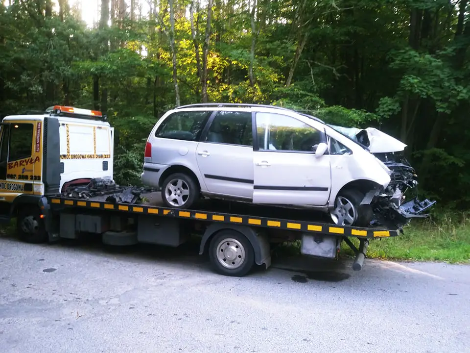 Pomoc drogowa zabrała rozbity samochód z pobocza. Przejazd drogą koło Kłodawy jest już odblokowany.