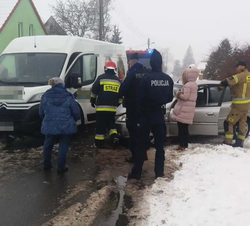 Do wypadku doszło po godz. 13.00. Kierująca kią hamując wpadła w poślizg i wyjechała na środek ul. Szkolnej. Ulicą Szkolną jechał bus, który uderzył w kię.