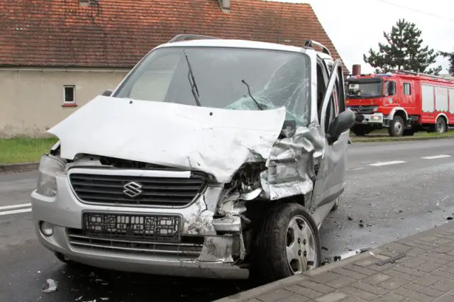 Mercedes bus uderzył w suzuki od strony kierowcy. Bus wpadł na chodnik i uderzył w płot posesji przy ulicy uszkadzając tablicę zasilania energetycznego.