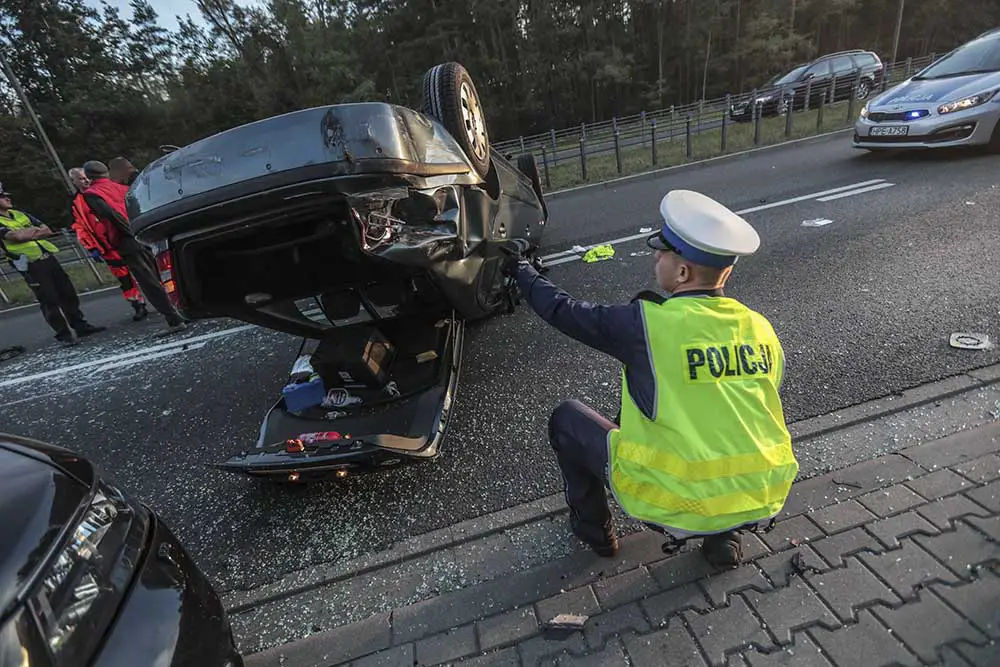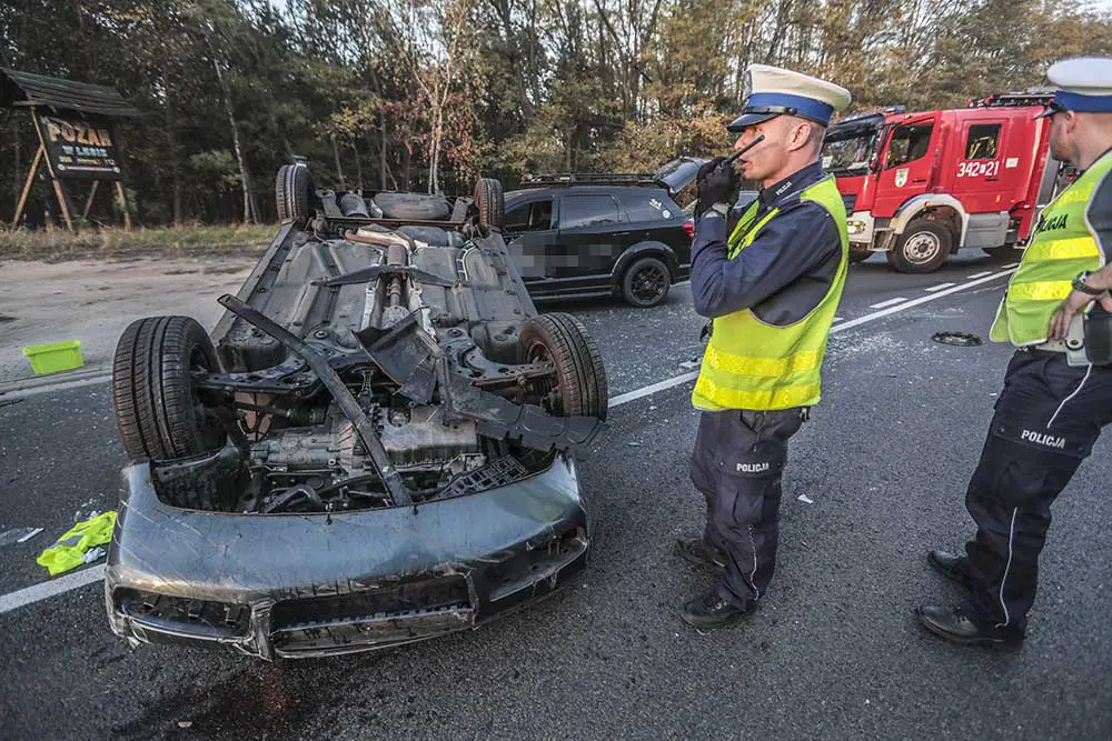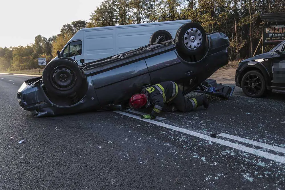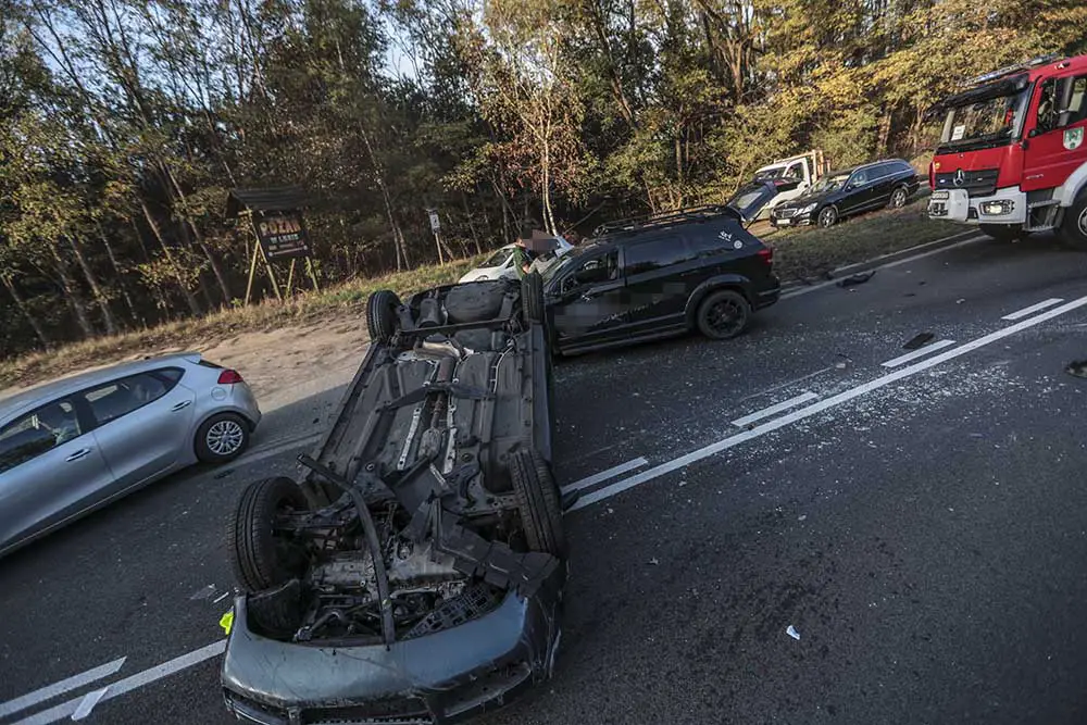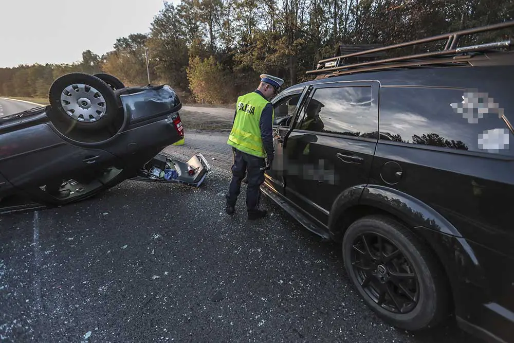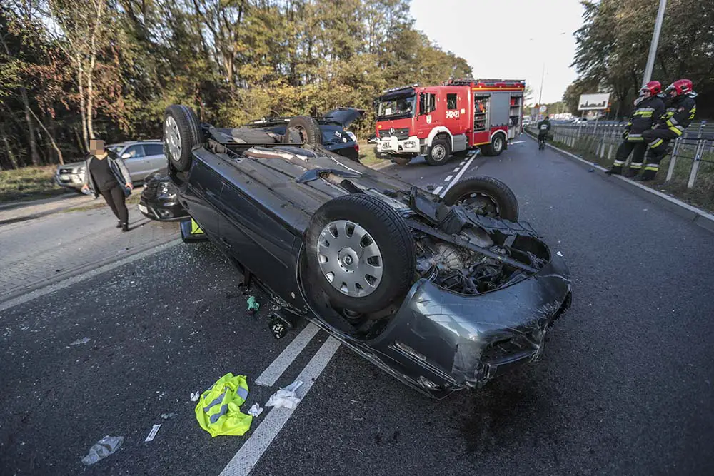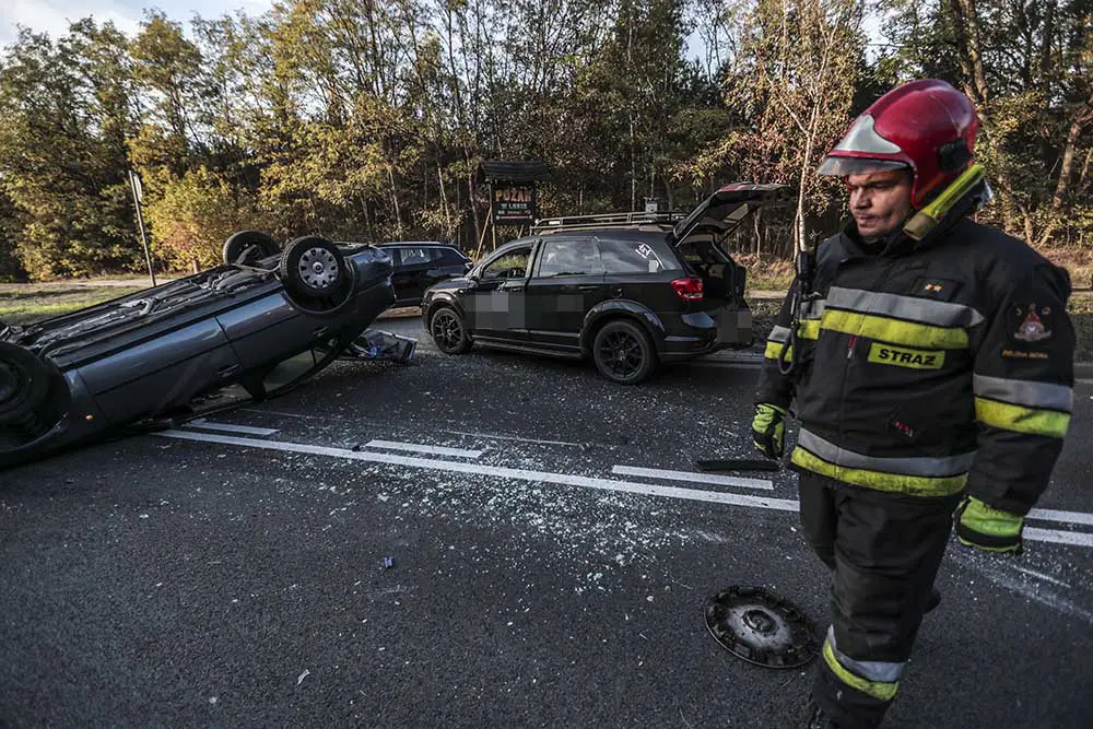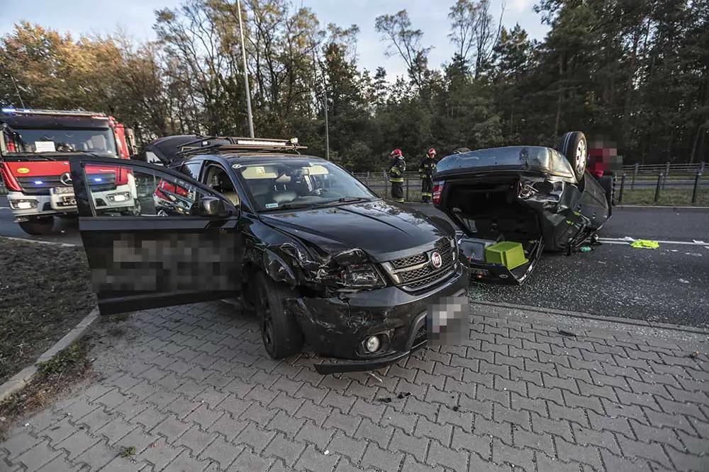 Fiat uderzył w tył skody, która wpada w poślizg. Skoda wleciała na barierki, odbiła się od nich, uderzyła w fiata i dachowała.