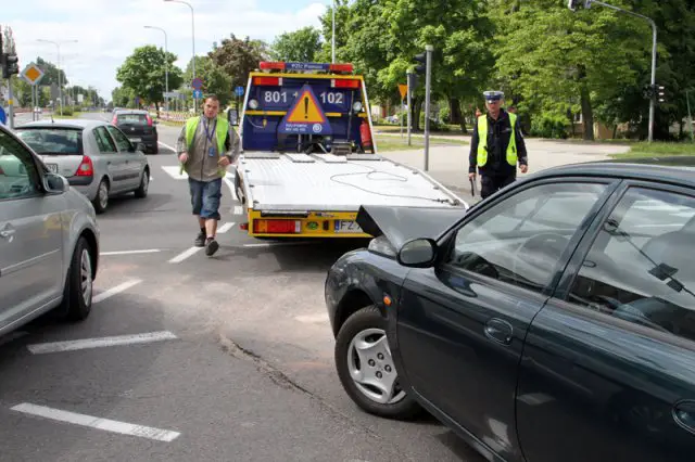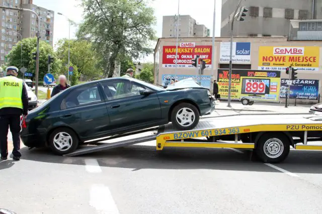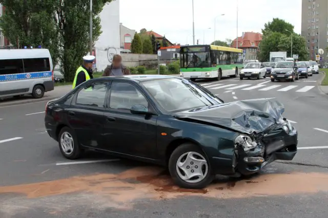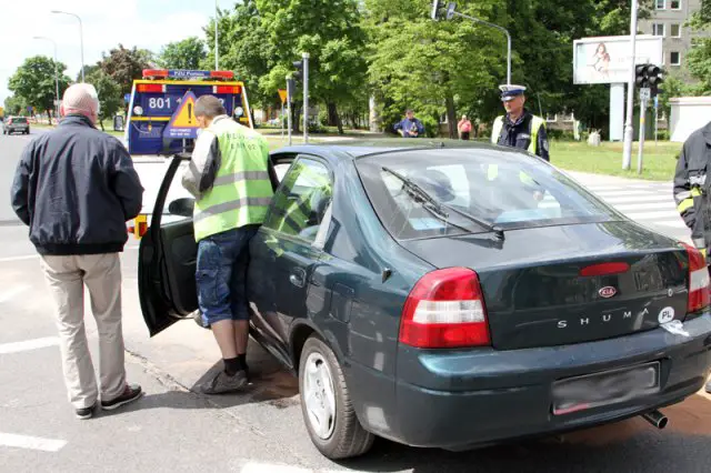 Kierowca samochodu kia nie zauważył, że ma czerwone światło. Wjechał na skrzyżowanie i tam zderzył się z volkswagenem. Pasażerka z volkswagena została zabrana do szpitala. Kierowca kia doznał rozbicia głowy.