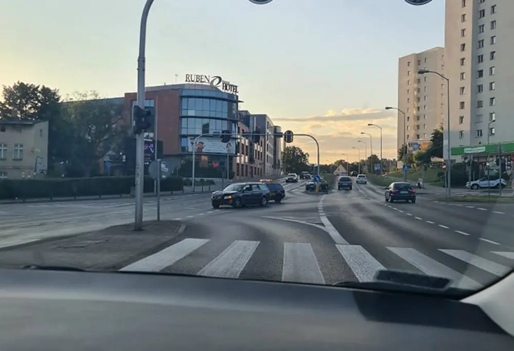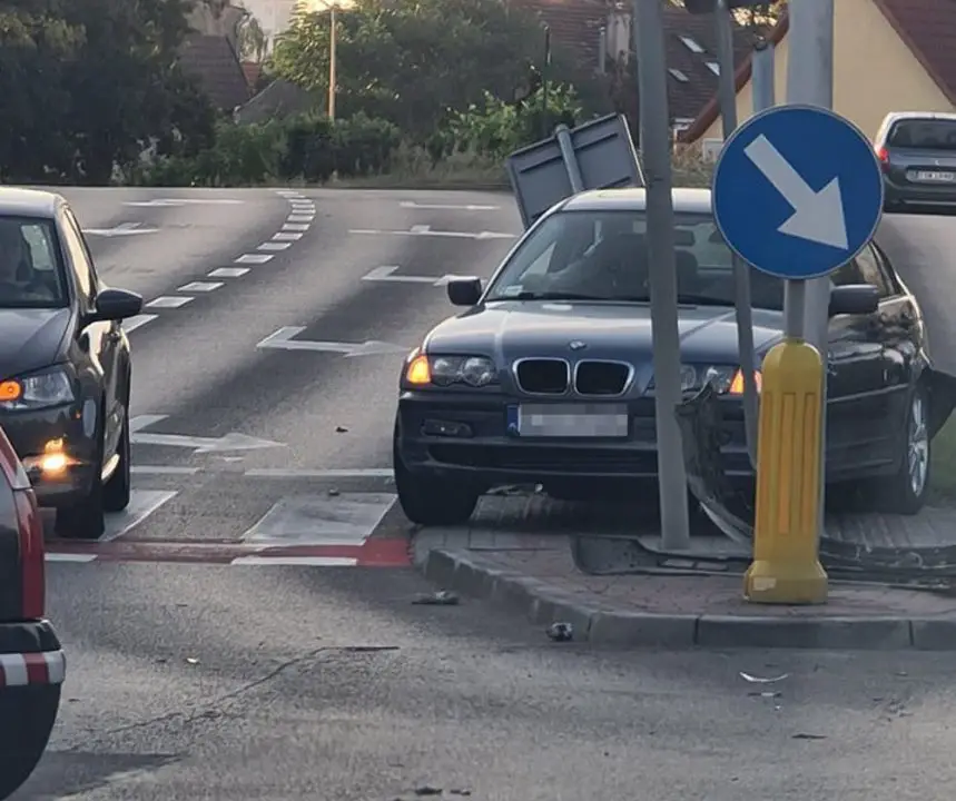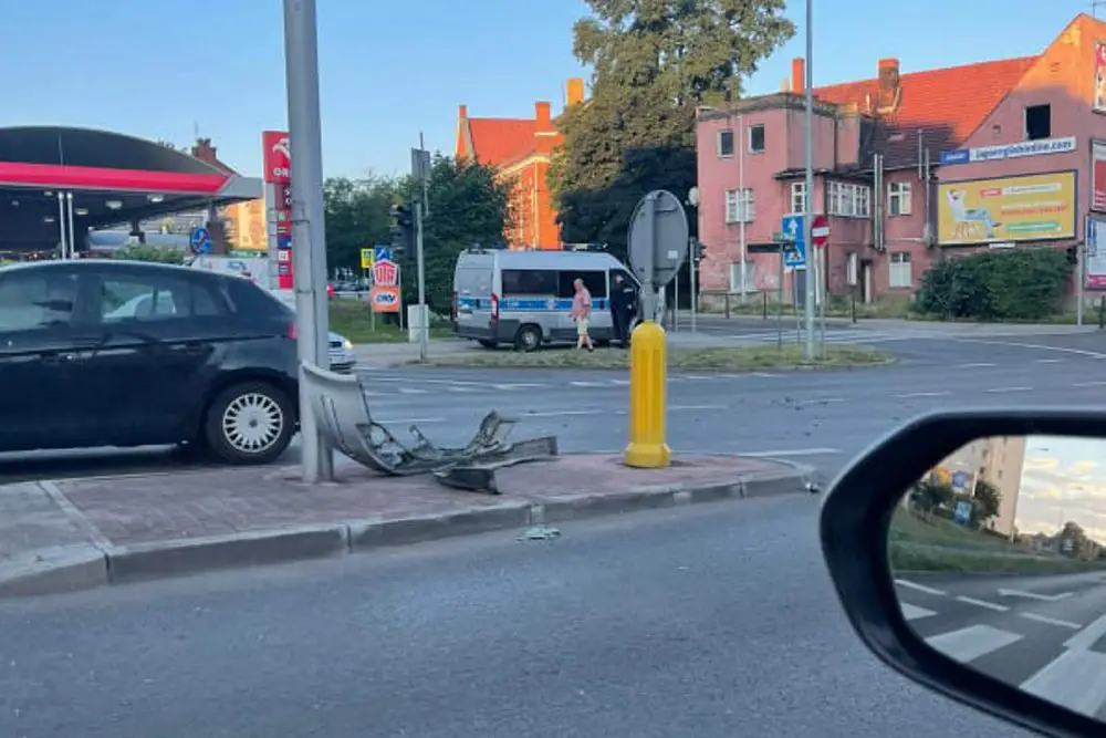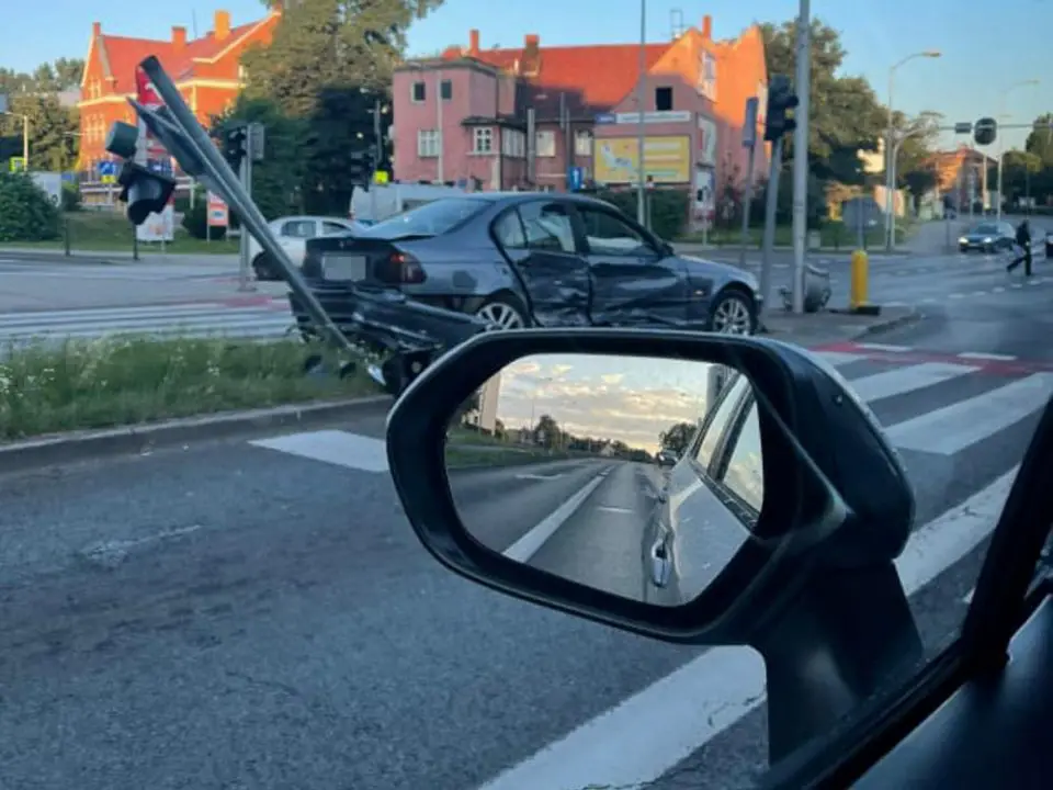 Bmw po uderzeniu obróciło się na drodze i wpadło na wysepkę miedzy drogami uderzając w znak drogowy i słup sygnalizacji świetlnej. Na szczęście na chodniku nie było pieszych.