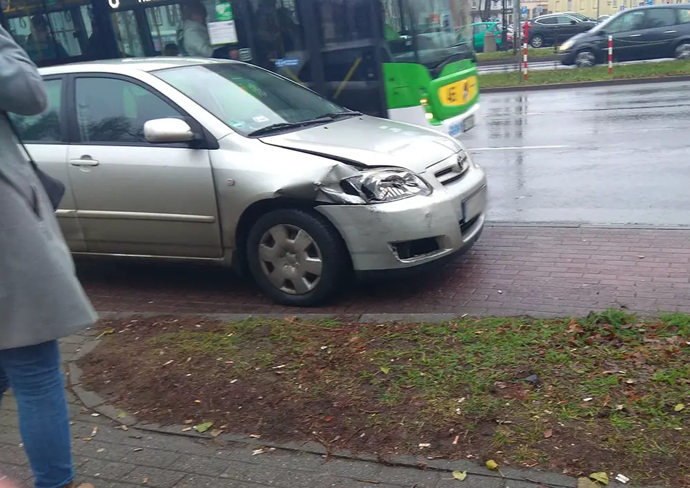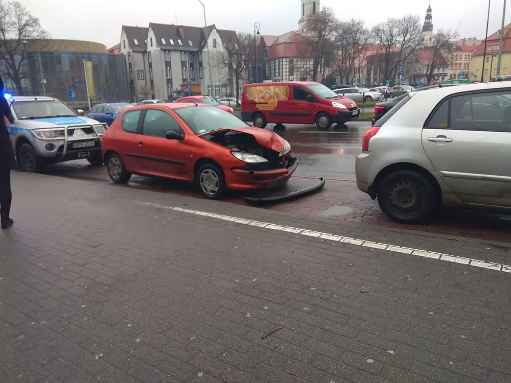 Kierujący toyotą jechał ul. Wojska Polskiego w kierunku ul. Bohaterów Westerplatte. Z ul. Plac Powstańców Wielkopolskich wyjeżdżał peugeot. Kierująca zrobiła to jednak tak nieostrożnie, że wjechała prosto pod toyotę. Kierujący toyotą robił co tylko mógł, żeby uniknąć zderzenia, ale nie udało mu się.