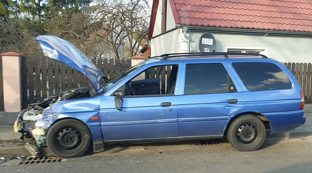 Ford ma mocno rozbity przód. Stoi na chodniku. Na chodniku stoi też peugeot. Jeden pas ruchu w kierunku miasta jest zablokowany. Na drodze wprowadzony jest ruch wahadłowy.