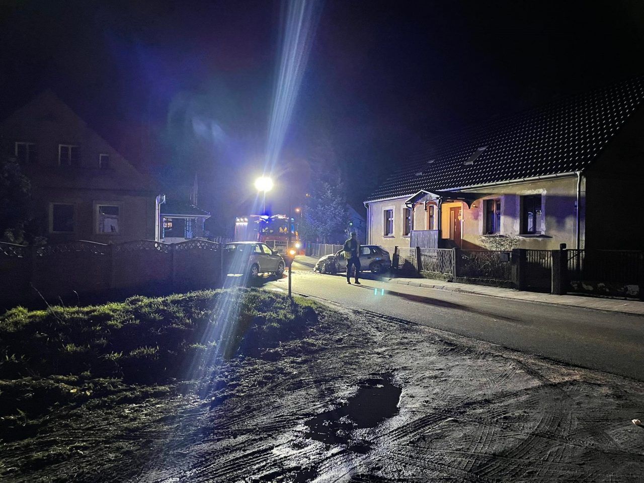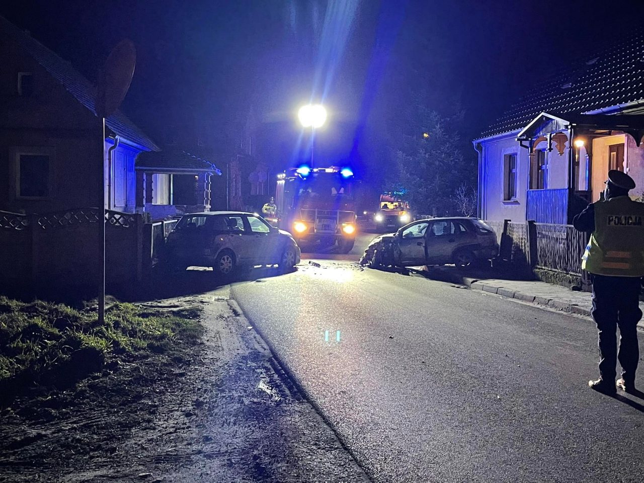 Do wypadku doszło na zakręcie. Rozbite samochody zablokowały drogę. Uszkodziły też płoty posesji. Ranne zostały dwie osoby. Obie trafiły do szpitala.