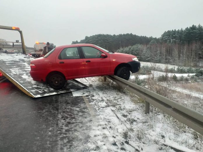Na drodze w Nowym Kisielinie kierowca osobówki wpadł w poślizg. Samochód uderzył w barierki wypadając częściowo za nie.