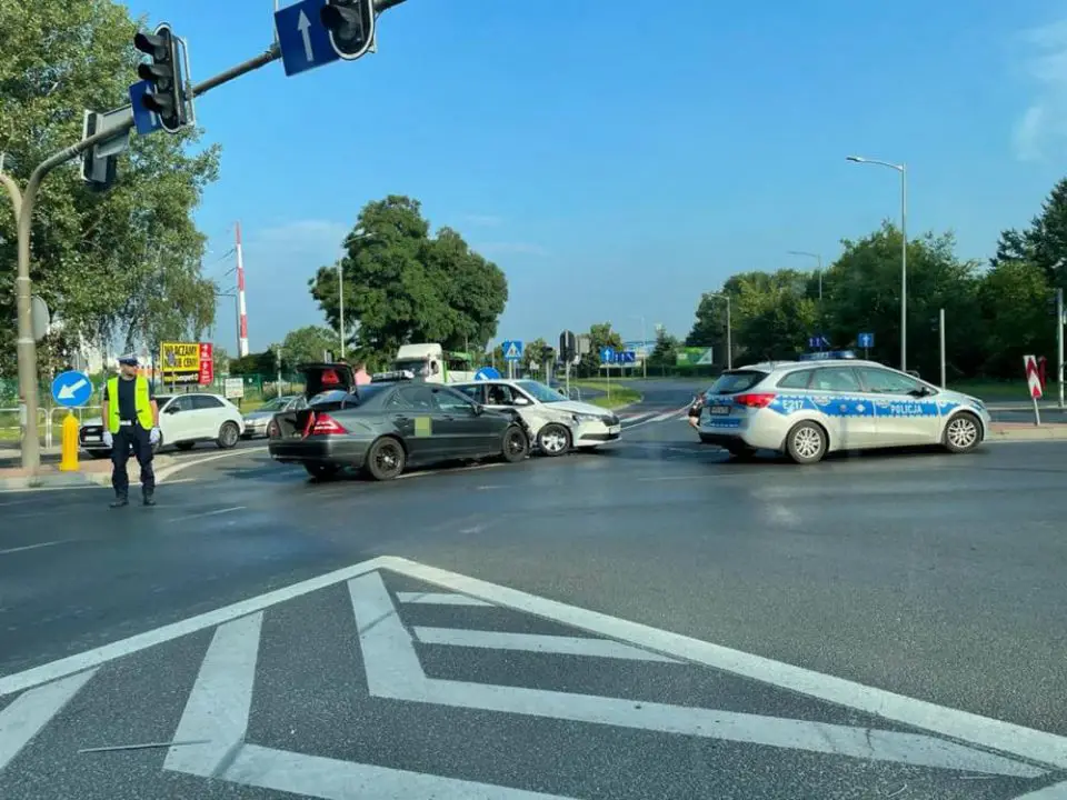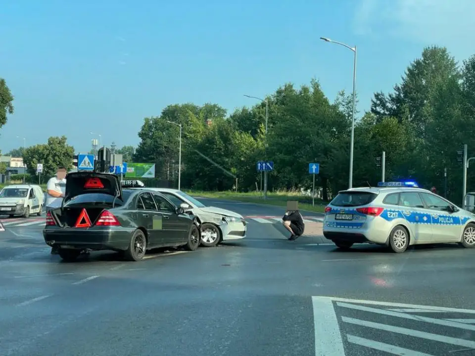 Na skrzyżowaniu zderzyły się dwie taksówki, skoda i mercedes. Oba samochody są mocno rozbite.