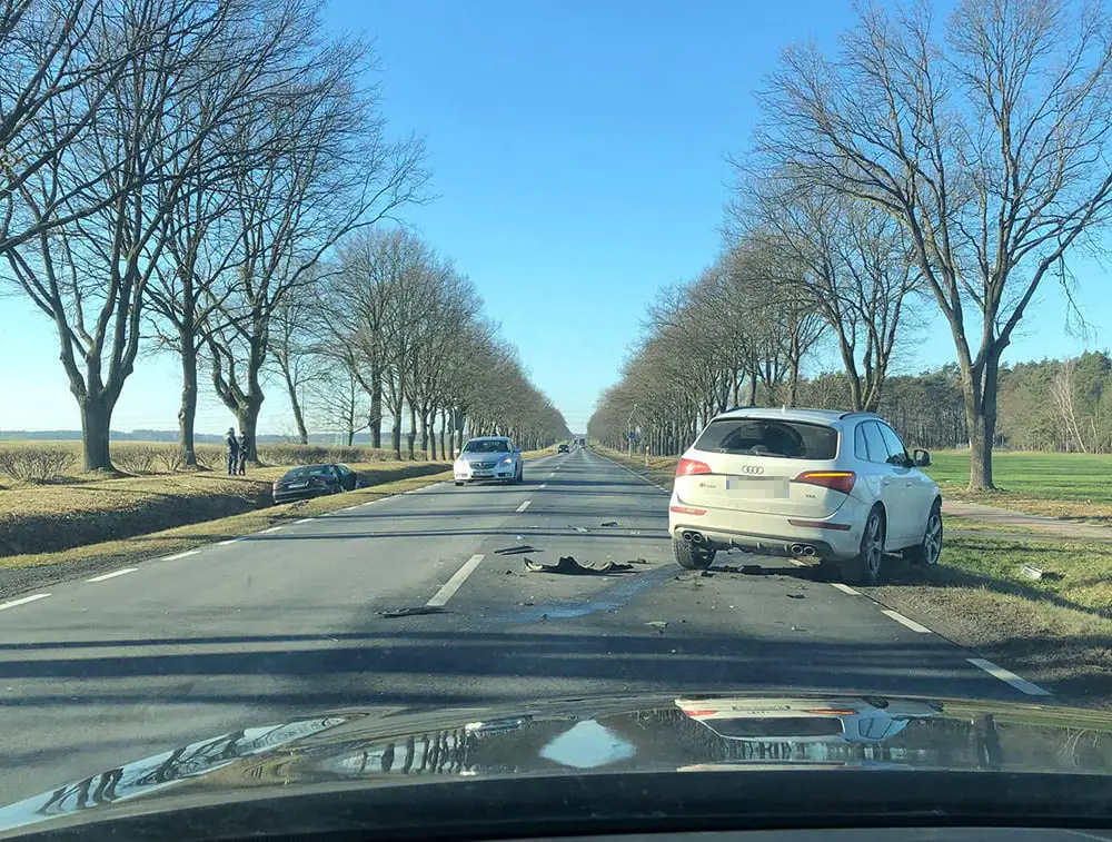 Audi po zderzeniu zostało na jezdni. Mercedes wpadł do przydrożnego rowu. Oba samochody zostały mocno rozbite. Audi ma uszkodzony przód, a mercedes bok. Na miejsce została wezwana zielonogórska policja.