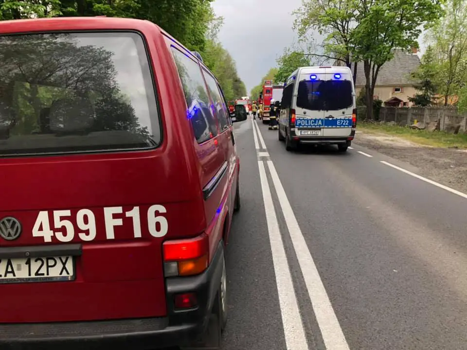 Do wypadku doszło około godz. 18.00. Audi zderzyło się z volkswagenem. Po zderzeniu audi wypadło z drogi do lasu, a volkswagen uderzył w ogrodzenie posesji. Na miejsce dojechały wozy straży pożarnej zawodowej z Żar i OSP Sieniawa Żarska i Lipinki. Dojechały również kartka pogotowia ratunkowego i żarska policja. Strażacy wycinali jedną z osób z rozbitego auta. Ranna została przewieziona do szpitala. Żarska policja ustala przyczynę oraz okoliczności wypadku.