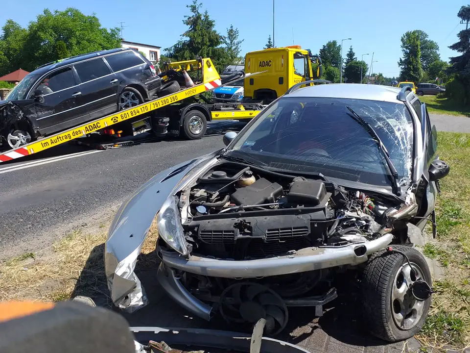 Samochody zostały bardzo mocno rozbite. Volkswagen ma zmiażdżony przód. Tak samo peugeot.