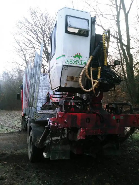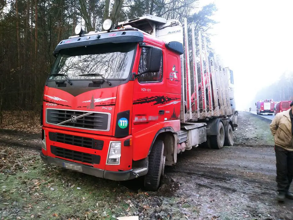 Po zderzeniu man wypadł z drogi. Na poboczu zatrzymała się ciężarówka do przewozu drewna.