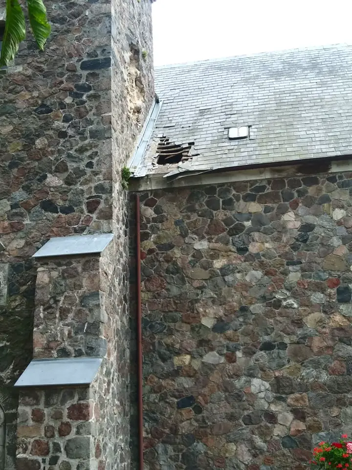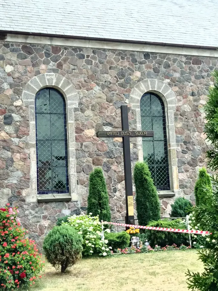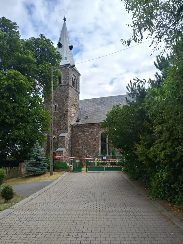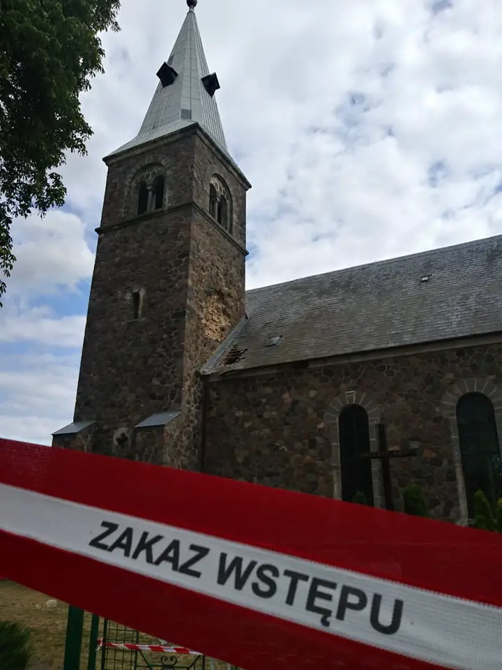 Do zdarzenia doszło w niedzielę, 7 lipca. Z wieży kościoła w Podlegórzu oderwały się kamienne elementy elewacji i runęły na dół. Kamienie uszkodziły dach.
