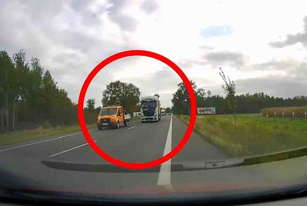 Skrajną nieodpowiedzialnością wykazał się kierujący pojazdem ciężarowym, którego zachowanie nagrała kamerka samochodowa innego kierowcy. Kierowca ciężarowego mercedesa wyprzedzał „na trzeciego”, zmuszając prawidłowo jadącego uczestnika ruchu drogowego do zjechania na pobocze. Na szczęście nie doszło do czołowego zderzenia pojazdów.