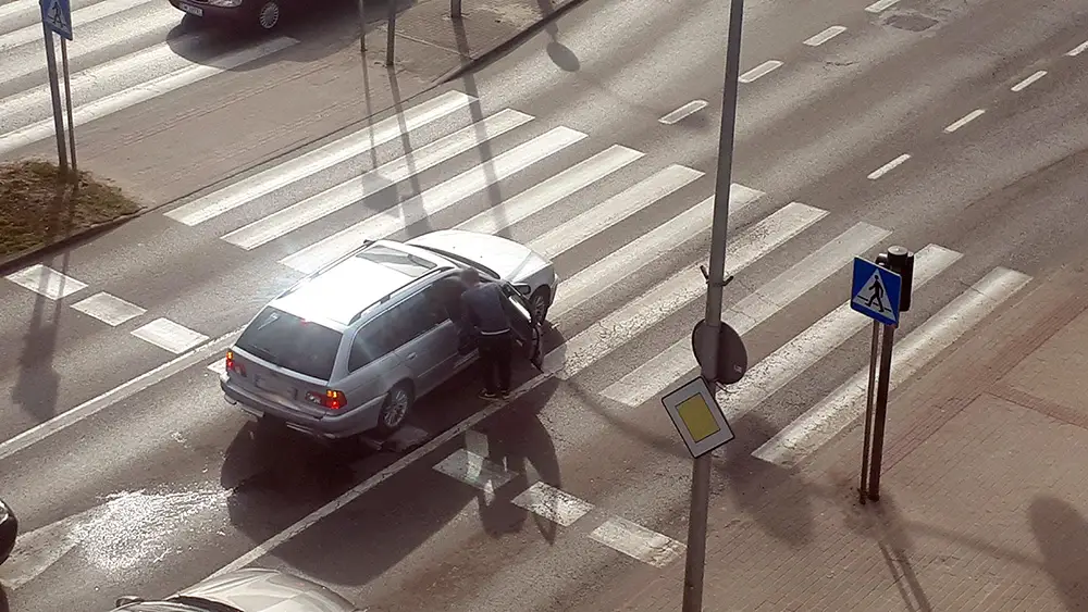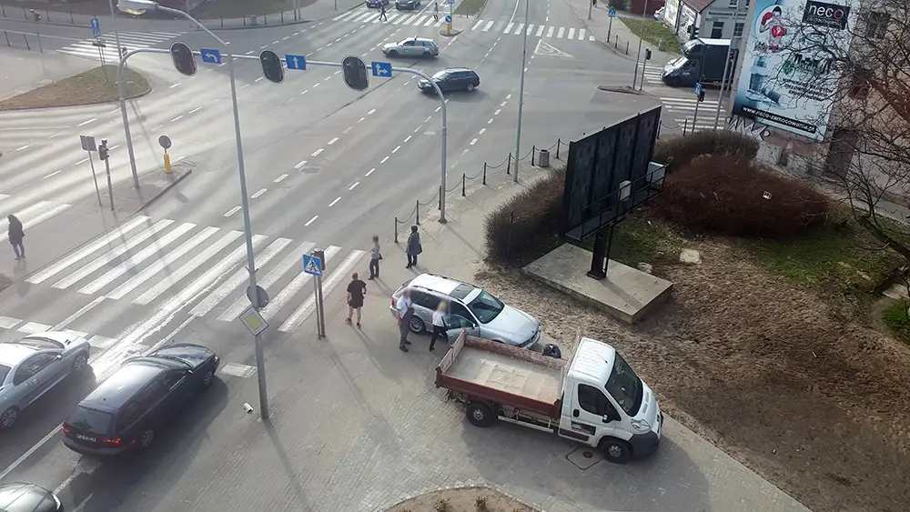 Uczestnicy kolizji zjechali na chodnik, żeby nie blokować ruchu na skrzyżowaniu.