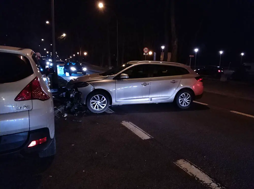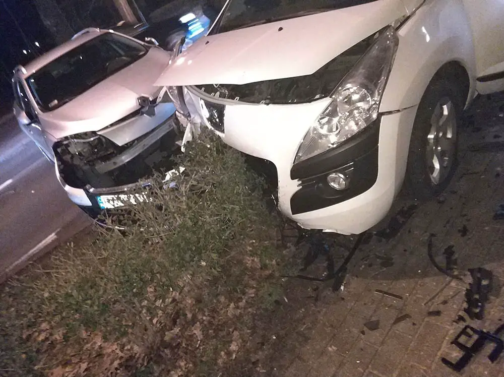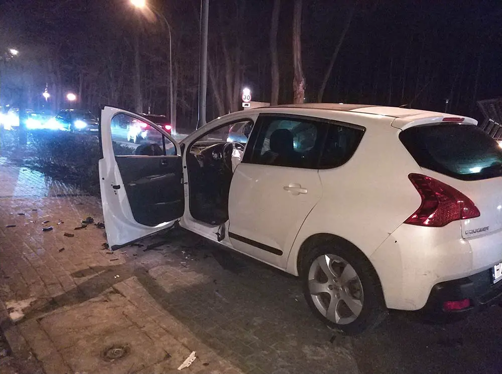 Peugeot i renault są mocno rozbite. Peugeot stoi za drogą. Renault stoi w poprzek ulicy blokując jeden pas ruchu. Sprawca jest kompletnie pijany.