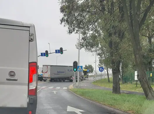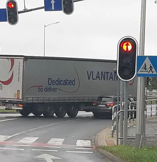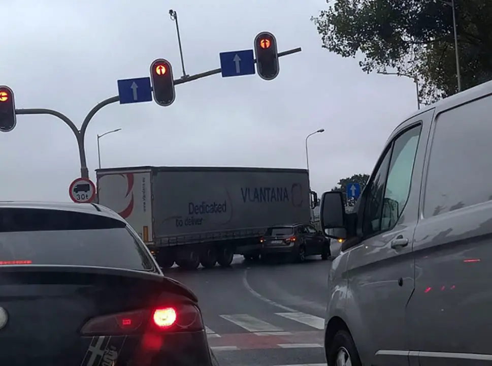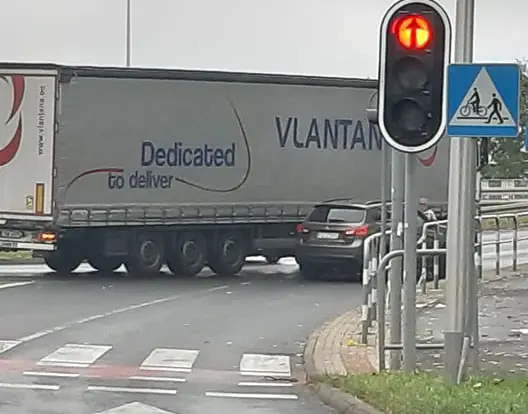 Osobówka została zepchnięta przez ciężarówkę na barierki. Na miejscu nie ma jeszcze policja.