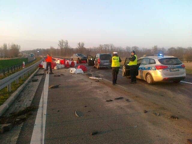 Droga w kierunku Sulechowa jest zablokowana. Na jezdni leżą porozbijane ograniczniki drogowców.
