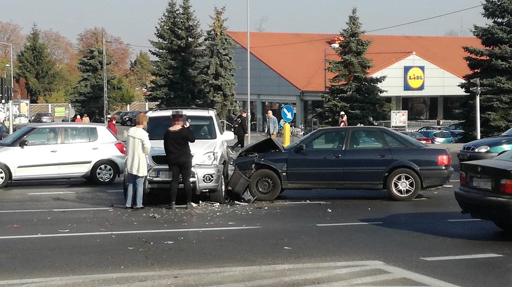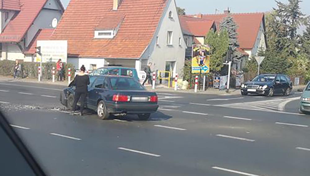 Do zderzenia doszło około godz. 11.30. Zderzyły się audi i hyundai. Audi stoi na środku skrzyżowaniu. Samochód jest mocno rozbity, hyundai zjechał na chodnik.