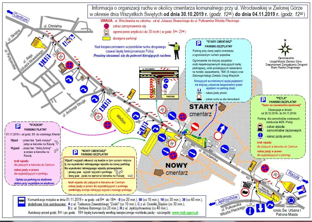 Osoby, które zdecydują się wyjechać na cmentarz samochodem muszą uzbroić się w cierpliwość i przestrzegać przepisów ruchu drogowego w związku z ograniczeniem dopuszczalnej prędkości pojazdów do 30 km/h. Jak co roku na ul. Wrocławskiej będzie obowiązywał zakaz zatrzymywania, ale zostaną także wyznaczone dodatkowe miejsca parkingowe.