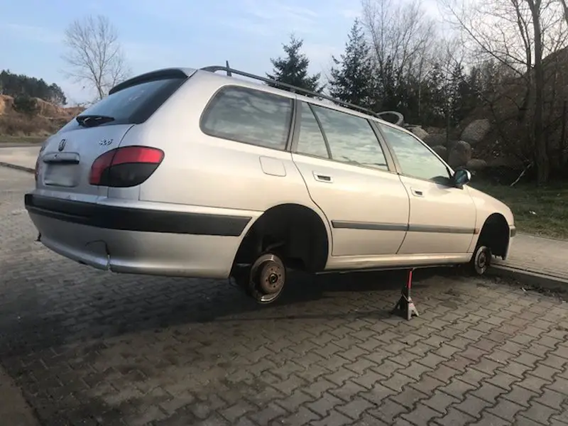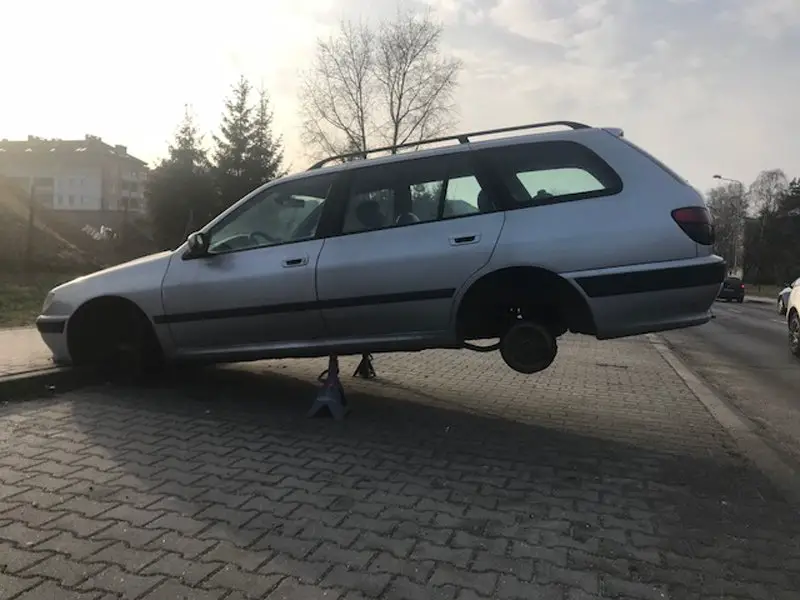 Peugeot został sfotografowany w czwartek przez naszego Czytelnika. – Wygląda jakby ktoś zmieniał koła, ale stoi tak od dłuższego czasu – pisze autor zdjęć.