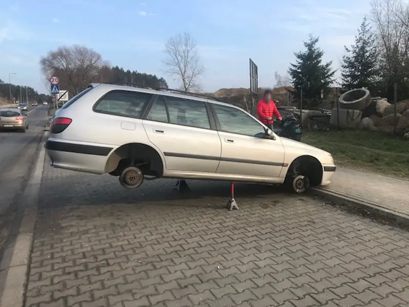 Peugeot stoi na parkingu przy ul. Rzeźniczaka. Jest uniesiony na podnośniku i nie ma kół. Samochód wzbudza zainteresowanie i zdziwienie przechodniów. Na peugeota spoglądają też kierowcy. – Przecież parking to nie warsztat – dziwi się nasz Czytelnik.