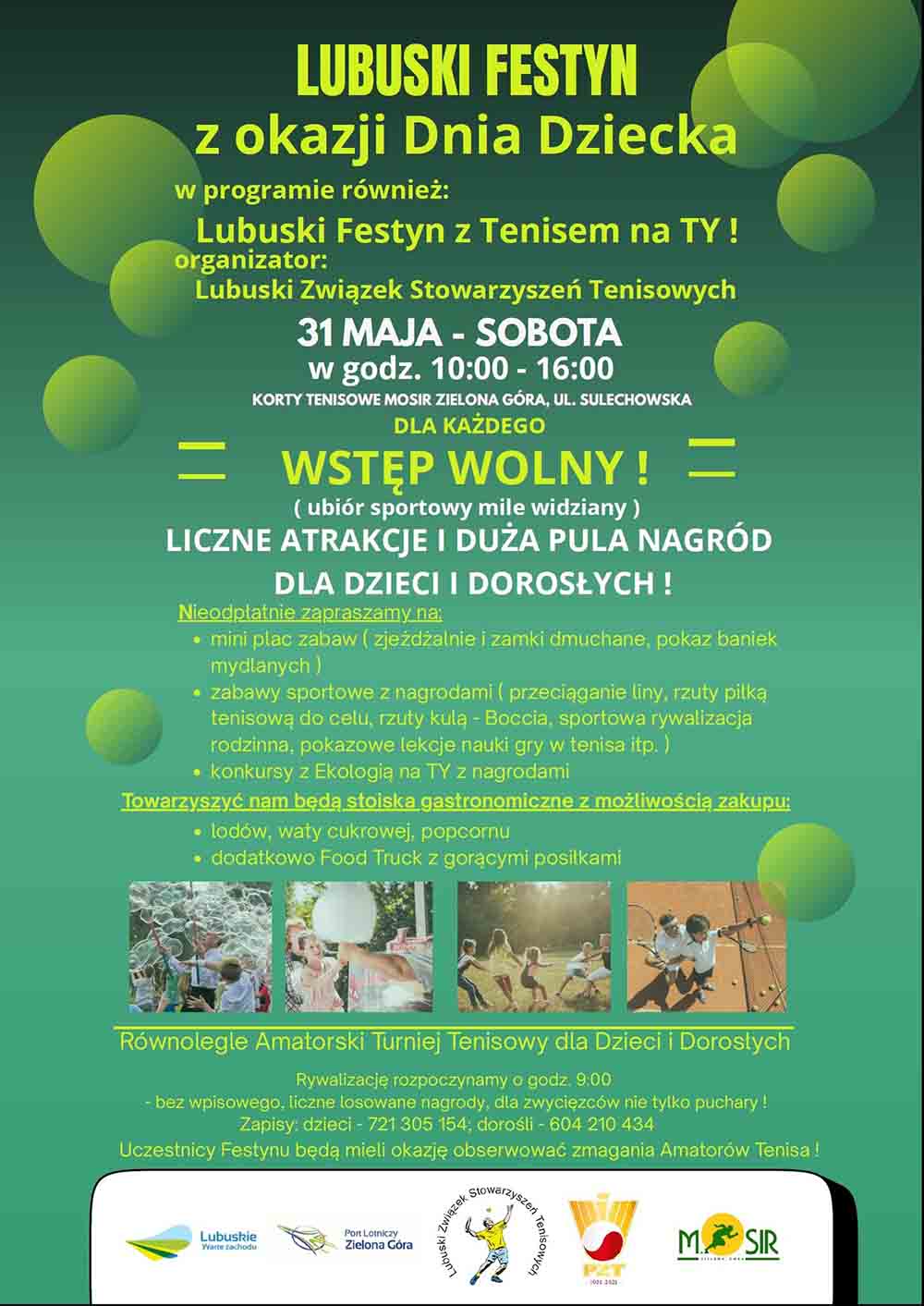 Początek festynu odbędzie się w godz. 10:00-16:00 na kortach MOSiR przy ul. Sulechowskiej. Uroczyste otwarcie odbędzie się w samo południe. W programie mnóstwo atrakcji i duża pula nagród dla dzieci i dorosłych. Równolegle odbędzie się Amatorski Turniej Tenisowy dla dzieci i dorosłych.