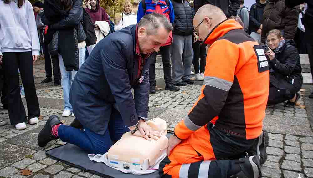 – Nie bójcie się działać. Pierwsza pomoc to umiejętność, która może uratować życie bliskiej osoby, sąsiada czy przypadkowego przechodnia – mówił Marcin Pabierowski, prezydent Zielonej Góry, który wziął udział w akcji i na fantomie odświeżył zasady pierwszej pomocy. Akcja to szansa, żeby pod okiem profesjonalistów nauczyć się, jak prawidłowo wykonać resuscytację, użyć defibrylatora AED czy opatrzyć ranę. To proste kroki, które każdy może opanować, bez względu na wiek czy doświadczenie.