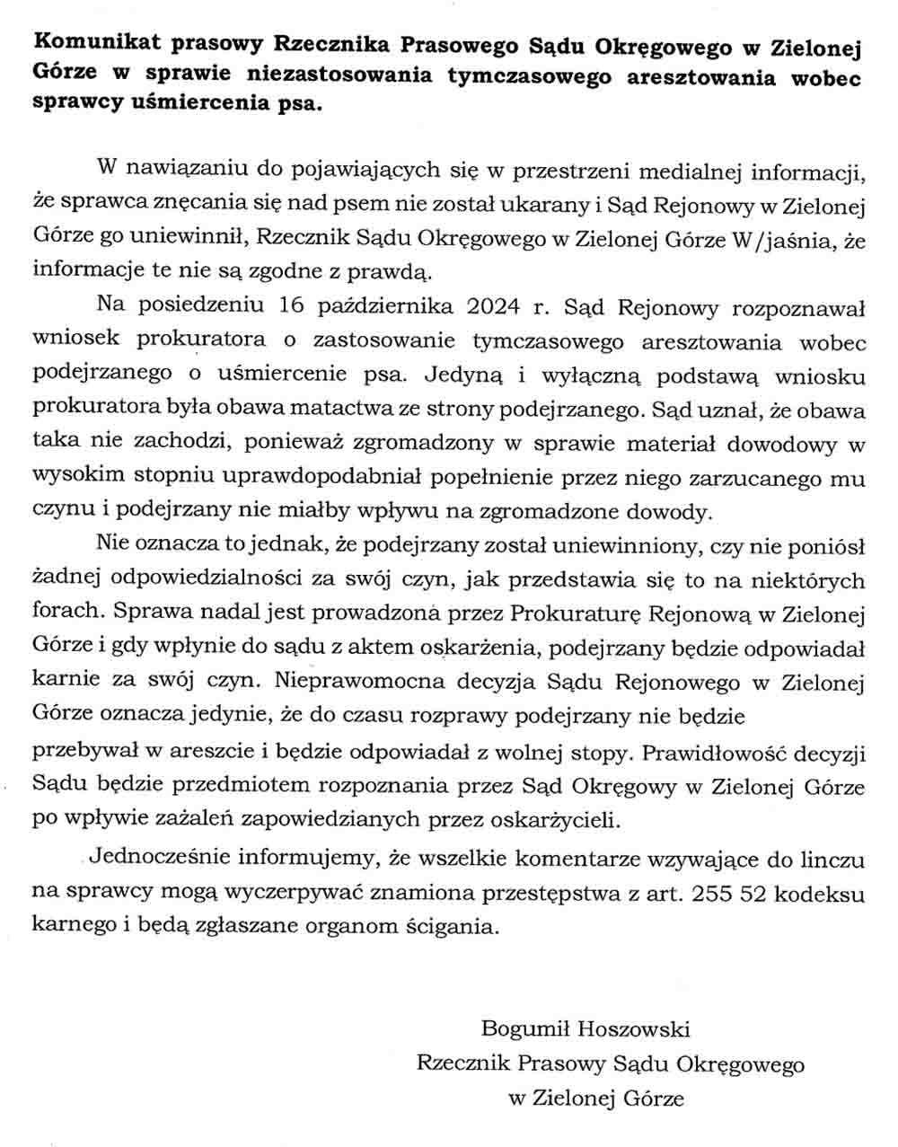 W środę, 16 października, zielonogórski sąd nie aresztował 33-arka zatrzymanego za śmiertelne skatowanie pieska Lusi w Niwiskach. Zdaniem sądu nie było podstaw do zastosowania aresztu. Prokuratura zaskarży decyzję sądu ponownie domagając się aresztu dla sadysty.
