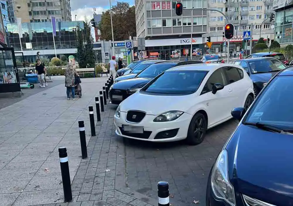 Parking został ograniczony słupkami, ponieważ kierowcy wjeżdżali na chodnik. Teraz nadal parkują nieprawidłowo, tylko samochody stoją częściowo na jezdni.