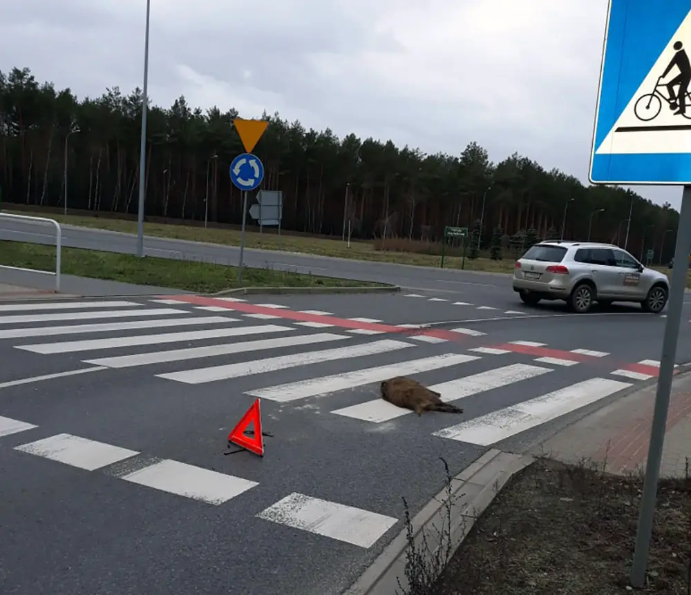 Policję o potrąconym dziku powiadomili kierowcy. Na miejsce pojechał patrol policji. Po chwili dotarła zielonogórska straż miejska, która zabezpieczyła miejsce potrąceni dzika. Martwy zwierzak został zabezpieczone zgodnie z obowiązująca procedurą w związku z ASF. Stąd mężczyzna z ubraniu ochronnym.