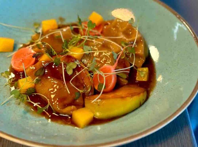 Pięknie z pierożkami komponuje się smażone jabłko, które doskonale uzupełniało danie. Jabłka były perfekcyjnie usmażone w nalewce ze śliwki węgierki, która tworzy cudowny i delikatny sosik. W połączeniu z kaczka i delikatnym ciastem tworzy potrawę idealna oraz pełną. Pierożki były nie tylko smaczne, ale i pięknie prezentowały się na talerzu. Ich naturalna słodycz harmonizowała z pikantnością kaczki, tworząc niezapomniane połączenie smakowe.
