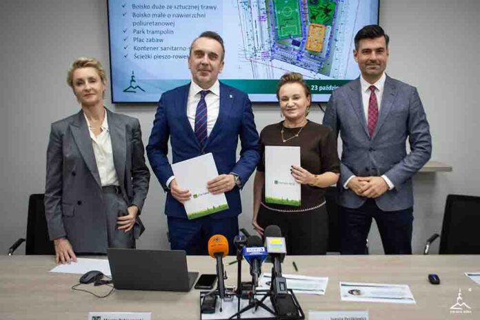 Nowy kompleks sportowy powstanie po prawej stronie drogi wjazdowej do osiedla Czarkowo. Dzieci i młodzież zagrają tam, w piłkę nożną, siatkówkę i koszykówkę. Skorzystają również z placu zabaw i trampolin. Prezydent Marcin Pabierowski w czwartek, 23 października, podpisał umowę na wykonanie inwestycji z zielonogórską firmą Mizar.