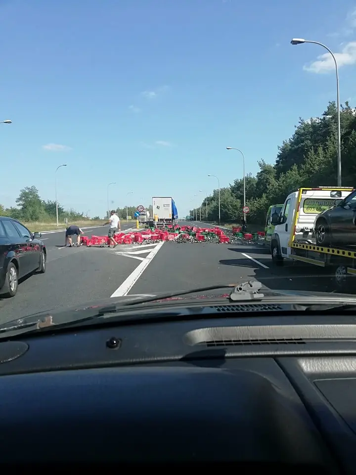 Do zdarzenia doszło w piątek, 23 sierpnia. Z ciężarówki wypadły przewożone butelki. Są utrudnienia w ruchu.