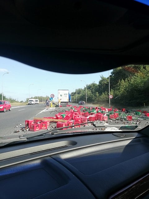 Butelki wypadły z ciężarówki na Trasie Północnej na wysokości wyjazdu ze strefy. Leża na pasach ruchu w kierunku trasy S3. Na drodze są utrudnienia w ruchu. Dwa pasy są zablokowane butelkami. Na miejsce została wezwana straż pożarna oraz zielonogórska policja.