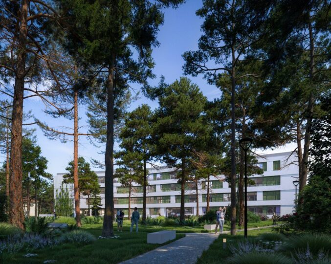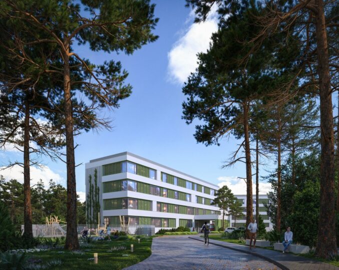 Czterokondygnacyjny budynek w kształcie litery L, mocno przeszklony, z ruchomymi okiennicami, otoczony zielenią. Centrum Leczenia Dzieci i Młodzieży pokazało wizualizację nowej lecznicy.