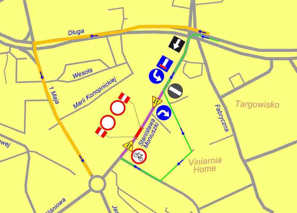 W związku z prowadzonymi pracami zamknięty będzie przejazd głównym przebiegiem ul. Moniuszki. Przejazd zostanie puszczony przez osiedle Viniarnia Home zgodnie z załączoną mapką. Mając na uwadze występujące utrudnienia zaleca się alternatywny objazd ul. Długą i 1 Maja.