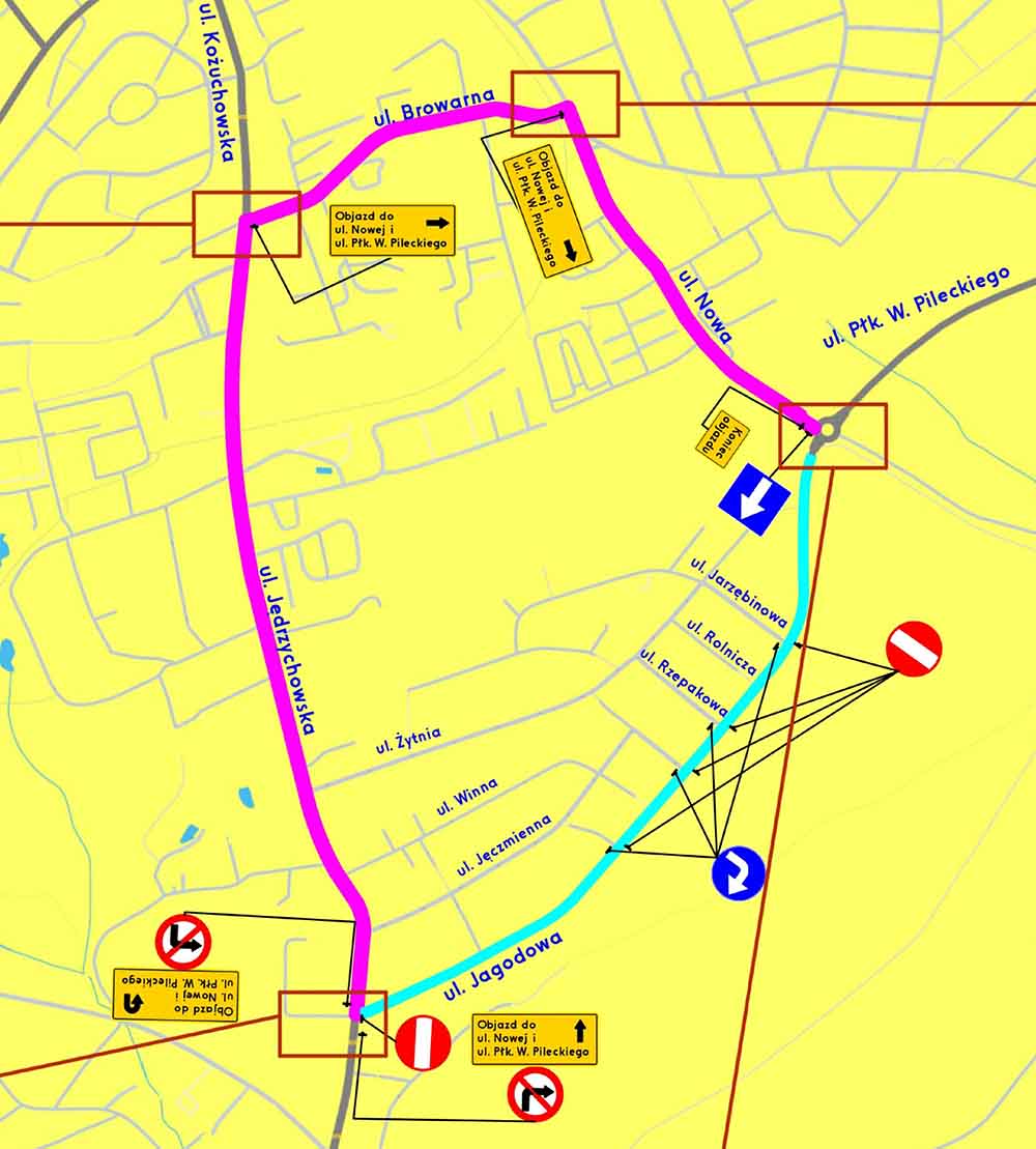 W aktualnym etapie ruch ul. Jagodową będzie odbywał się jednokierunkowo od ul. Płk. W. Pileckiego w kierunku ul. Jędrzychowskiej. W przeciwnym kierunku wyznaczone zostaną objazdy przez ul. Browarną i ul. Nową. Magistrat przypomina o stosowaniu się do obowiązującego oznakowania i poleceń kierujących ruchem. Termin zakończenia prac przewidziany jest na koniec lipca 2025 r. Mapka w galerii.