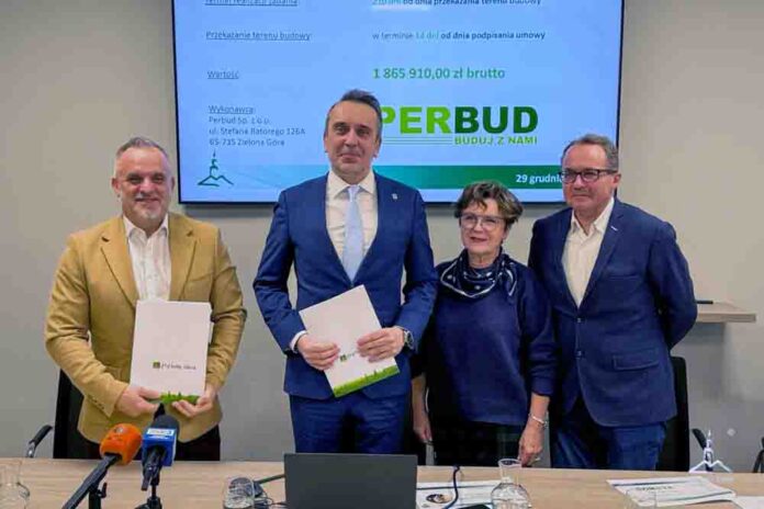 Świetna wiadomość dla uczniów i klubów sportowych. Zielonogórska firma Perbud wybuduje zaplecze szatniowo-sanitarne przy VI LO przy ul. św. Cyryla i Metodego. W poniedziałek, 29 grudnia, umowę z wykonawcą podpisał prezydent Zielonej Góry Marcin Pabierowski.