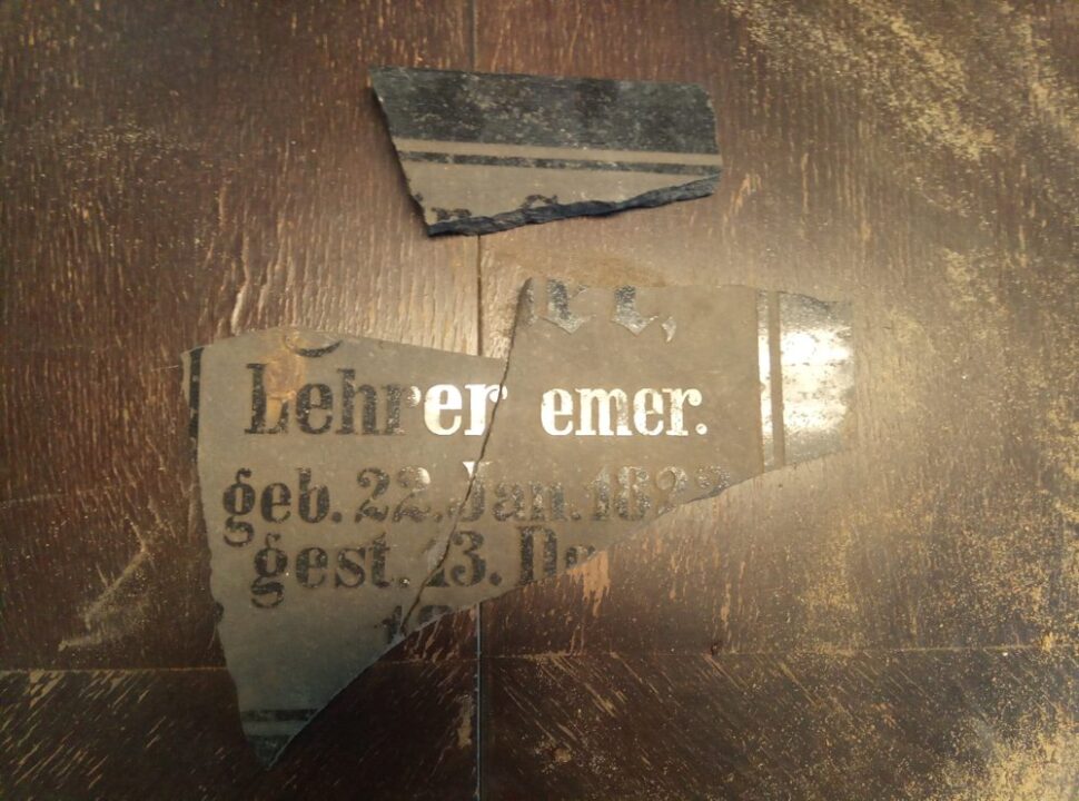 Paweł Stachowiak ma cień nadziei, że jeden z pochówków uda się zidentyfikować. Pokazuje mi fragment płyty znalezionej przy szczątkach. Brakuje części z imieniem i nazwiskiem, jest za to data dzienna urodzin i adnotacja, że zmarły był emerytowanym nauczycielem. – Urodził się 22 stycznia 1822 lub 1823 r. Zmarł 13 grudnia, ale roku już nie widać. Niewiele, ale może jakiś dociekliwy badacz rozwikła tę zagadkę – zastanawia się.