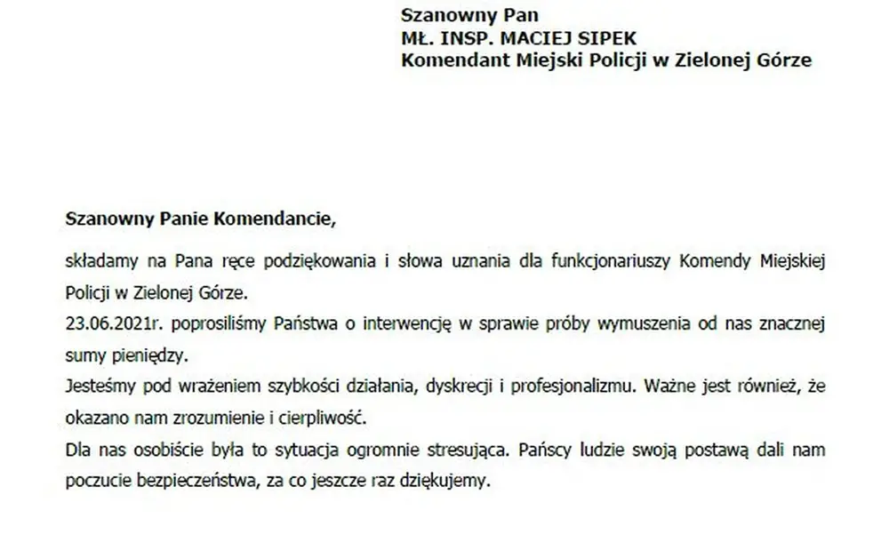 Mł. insp. Maciej Sipek, komendant miejski zielonogórskiej policji dostał bardzo miły list od mieszkanki miasta, która dziękuje policjantom kryminalnym za szybkie i profesjonalne działanie. Uniknęła straty dużej sumy pieniędzy.